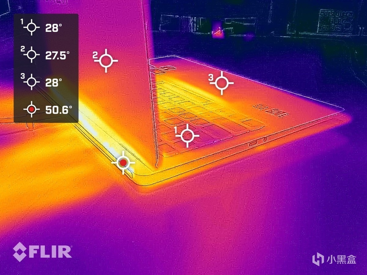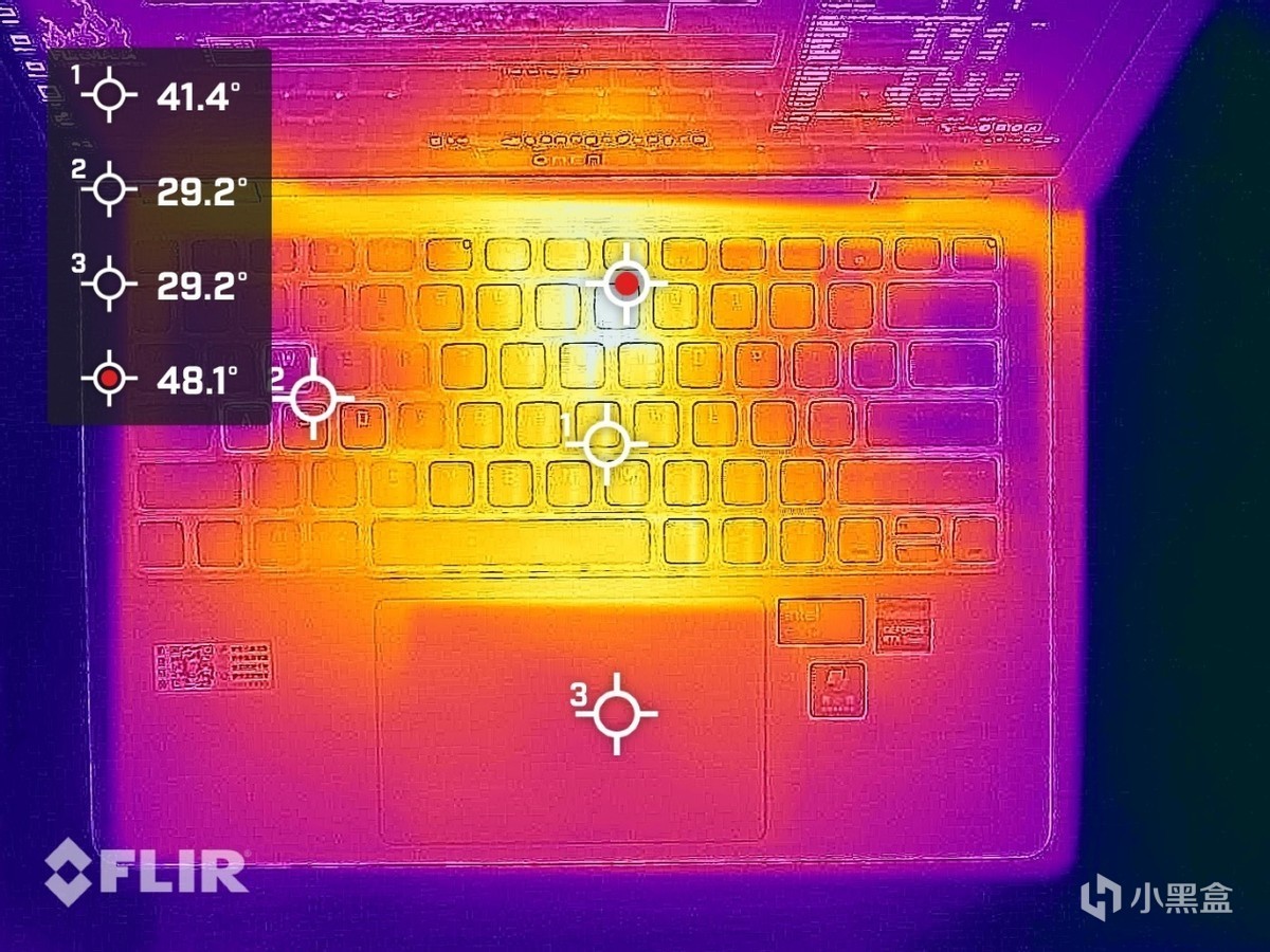 功耗控制带来的效果也很明显,尤其是在狂暴模式的双烘焙状态下,CPU的功耗也将从80W下降到60W左右。暗影精灵10s lim 14键盘表面最高散热温度集中在屏幕下端,在室温24℃的环境下最高温度不超过50℃。