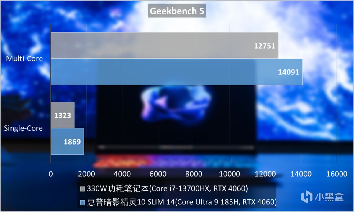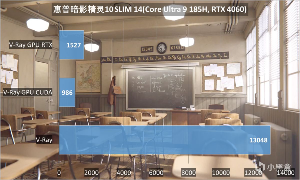 最后是创作环节。在Blender Benchmark中,我们用Most、Junkshop和Classroom三个测试场景来测试CPU和GPU的渲染输出能力。可以看到暗影精灵10 SLIM 14都表现出了不错的性能,其中酷睿Ultra 9 185H性能表现突出。由于能耗限制,RTX 4060笔记本电脑GPU相当于全性能RTX 4060笔记本电脑GPU的80%左右。即便如此,对于1.6kg左右的轻薄游戏本来说,还是相当够用的。