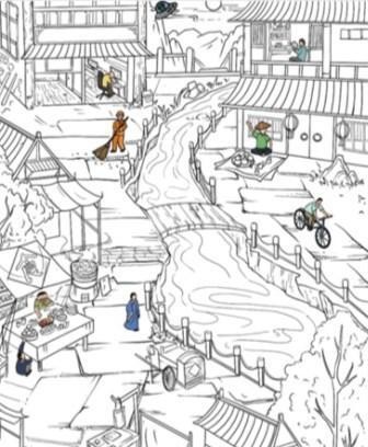 2。后面是小贩,学者,骑自行车的,还有左下角一个吃干饭的人。