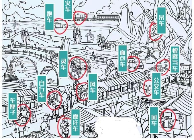 2。图片中间可以看到顶部的火车,旁边是跑车,中间是灵车,左下角是卖樱桃的人,右边是摩托车