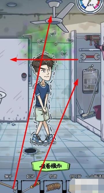 5。打开水龙头,装上空气清新剂,拖到蚊虫区,用刷子把报纸刷成白纸,交给借纸的大叔。然后用扳手把吹风机改造成电焊枪,烤马桶。